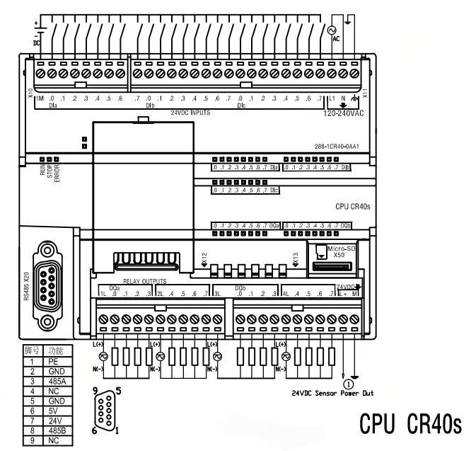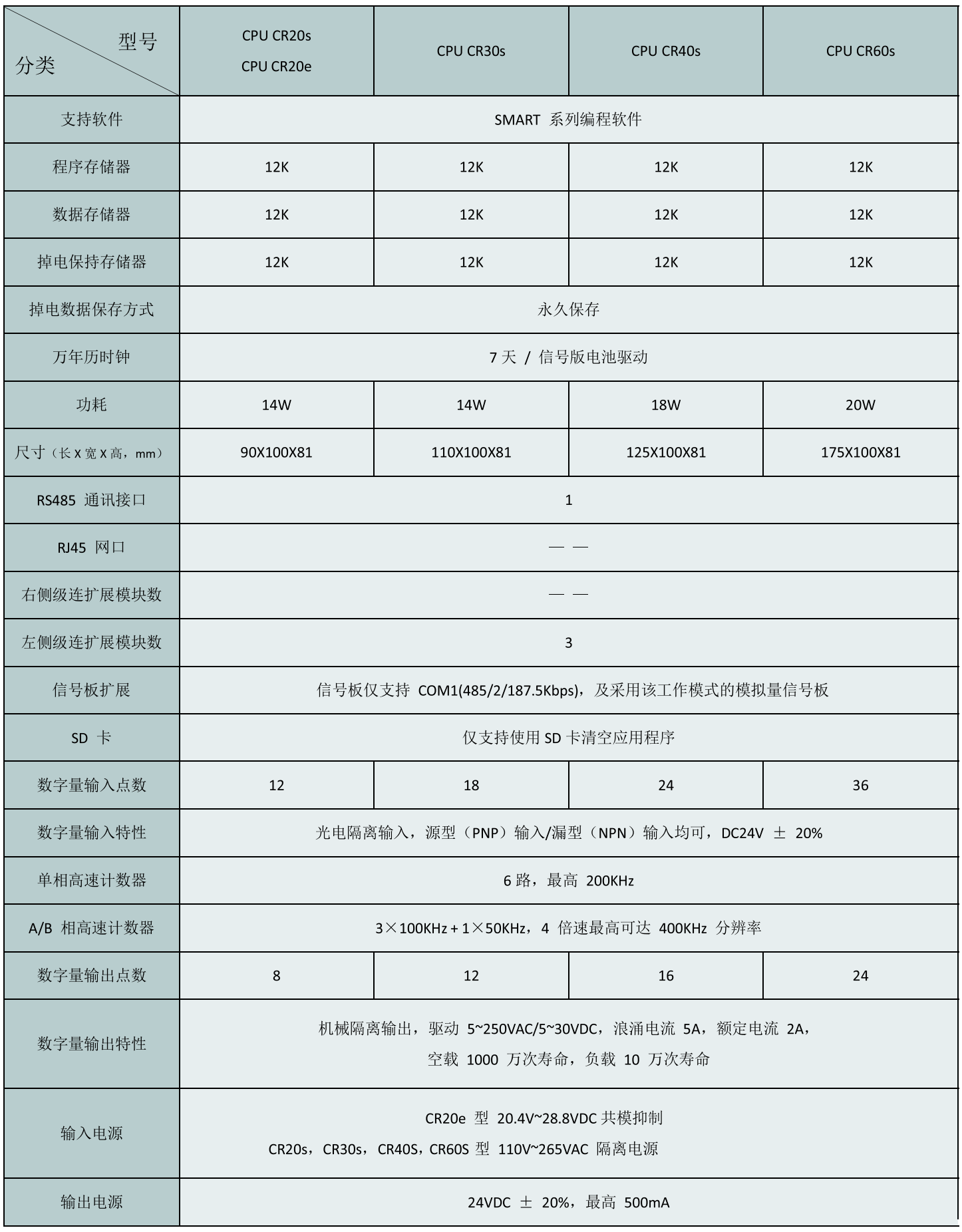 SMART200 CPU CR40s,288-1CR40-0AA1,220VAC 供電, 24DI 光電隔離輸入(源型 PNP 輸入 / 漏型 NPN 輸入,DC24V ± 20%),16DO 機械隔離輸出(繼電器,驅動 5~250VAC/5~30VDC,浪涌電流 5A,額定電流 2A),單相 200KHz / AB相 400KHz 高速計數輸入,提供 24VDC 500mA 電源輸出 ,集成 1 個 RS485 通訊端口、數據永久保存,可左側擴展三個模塊,信號板僅支持CM01(485/2/187.5Kbps),及采用該工作模式的模擬量信號板,僅支持使用SD卡清空程序。