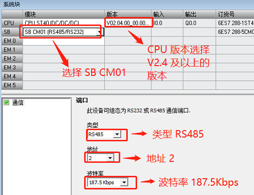4、在 SB 模塊通信端口配置中,類型選擇 RS485,地址選擇 2,波特率選擇 187.5Kbps;