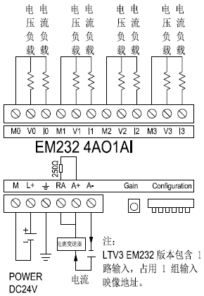 模擬量輸入輸出模塊,1AI/4AO 差分 電流(0~20mA)/ 電壓(0~10V、0~5V,±2.5V,±5V,±10V)輸入,電流(0~20mA)/ 電壓(0~10V)輸出, 分辨率 12bits,精度 ±0.3%~±0.6% 滿量程,LT-200 V3 系列 CPU 擴展模塊。