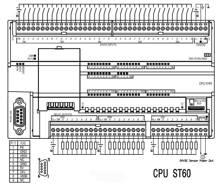 SMART200 CPU ST60,288-1ST60-0AA1,24VDC 供電, 36DI 光電隔離輸入(源型 PNP 輸入 / 漏型 NPN 輸入,DC24V ± 20%),24DO 光電隔離輸出(晶體管 源型 PNP 輸出,驅動 20~28.8VDC,浪涌電流 8A,額定電流 0.7A),3*100KHz 高速脈沖輸出,單相 200KHz / AB相 400KHz 高速計數輸入,提供 24VDC 500mA 電源輸出 ,集成 1 個 RS485 串行端口、1 個以太網口,可擴展 1個 RS485/RS232 串行端口,支持 S7 、PPI 、MODBUS 、USS 等通訊協議及開放式 TCP、UDP、自由口等通信,數據永久保存,支持標準擴展及左側擴展,左側最多連接3級擴展模塊,右側最多連接6級標準擴展模塊;?支持信號板擴展,數字量 IO 最多可達 352 個,模擬量 IO 最多可達 100 路。