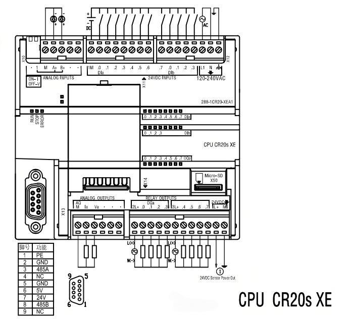 SMART200 CPU CR20s XE,288-1CR20-XEA1,220VAC 供電, 12DI 光電隔離輸入(源型 PNP 輸入 / 漏型 NPN 輸入,DC24V ± 20%),8DO 機械隔離輸出(繼電器,驅動 5~250VAC/5~30VDC,浪涌電流 5A,額定電流 2A),單相 200KHz / AB相 400KHz 高速計數輸入,提供 24VDC 500mA 電源輸出 ,模擬量輸入2AI(AIW0,AIW2),非隔離單端12位模擬量輸入,具備電流電壓 輸入信號源 選擇撥碼,電壓信號量程0 ~ 10V,(對應 0 ~ 27648),電流信號量程,0~20MA(對應 0~13824,內部匹配電阻 250Ω) 電流輸入量程,模擬量輸出1AO(非隔離單端12位模擬量輸出),電壓輸出量程0 ~ 10 V(對應 0 ~ 27648),最小驅動電阻 5000Ω,電流輸出量程,0~20MA(對應 0-27648),最大驅動電阻 500Ω ,無模擬量信號診斷, 集成 1 個 RS485 通訊口; 可支持連接3級左側擴展模塊,自帶模擬量,數字量 IO 最多可達 116個,模擬量 IO 最多可達51路。